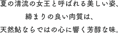 ABOUT AYU 鮎のこと わたしたち組合の漁場は、清流四万十川の上流地域にあります。 清流四万十川の流域の人々は、 夏には鮎を中心とする川漁を通して自然に親しみ共に暮らしてきました。 梅雨の時期を迎えると清らかな流れも増水し、 岩を咬む激流となります。 その苛酷な流れを克服して成長した四万十川の鮎は、 その美しい姿と肉質の締まりの良さで、 天下の一級品として各方面より高く評価をいただいています。